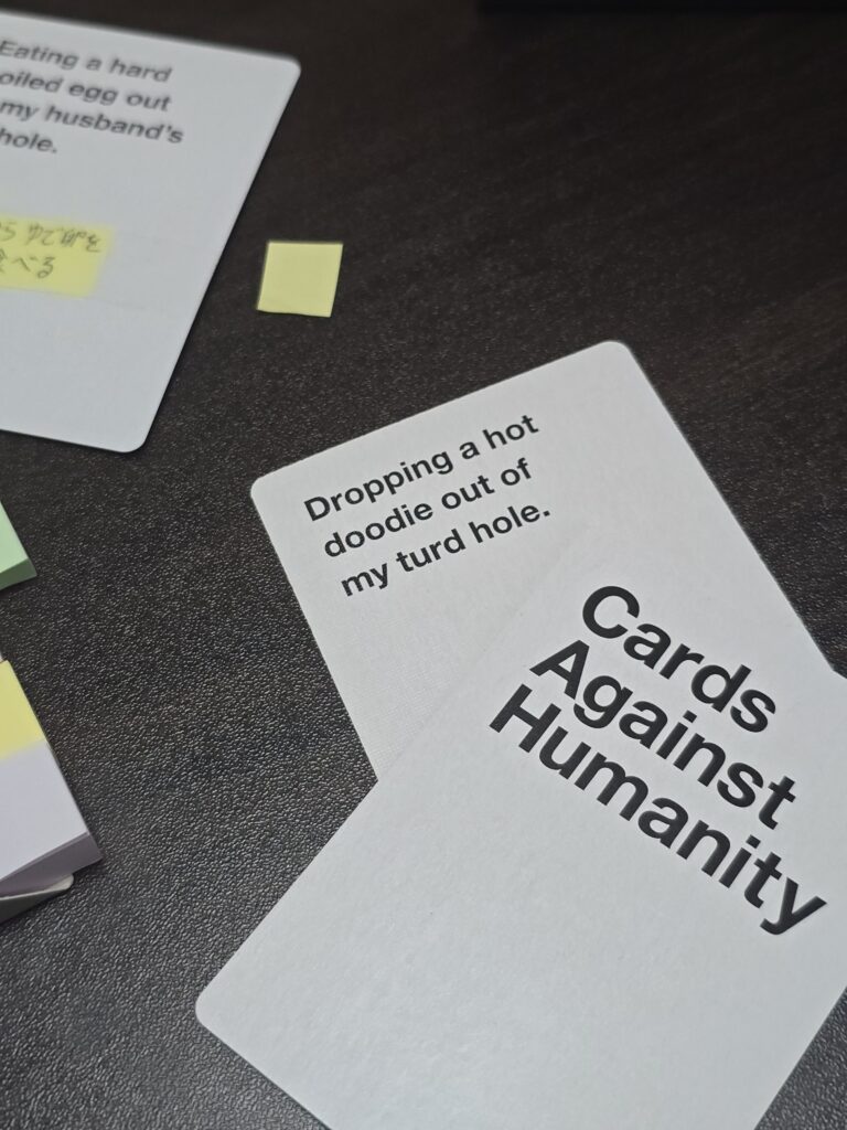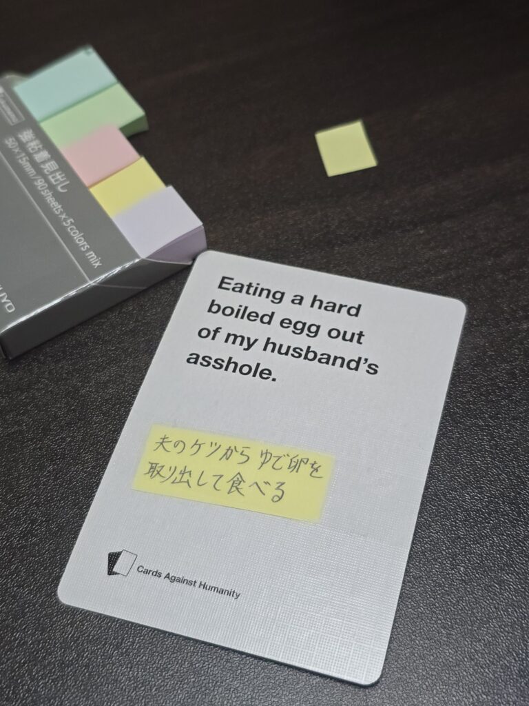 お題のカードを引き、それの回答を手札から出していちばん面白かったやつが勝ち!