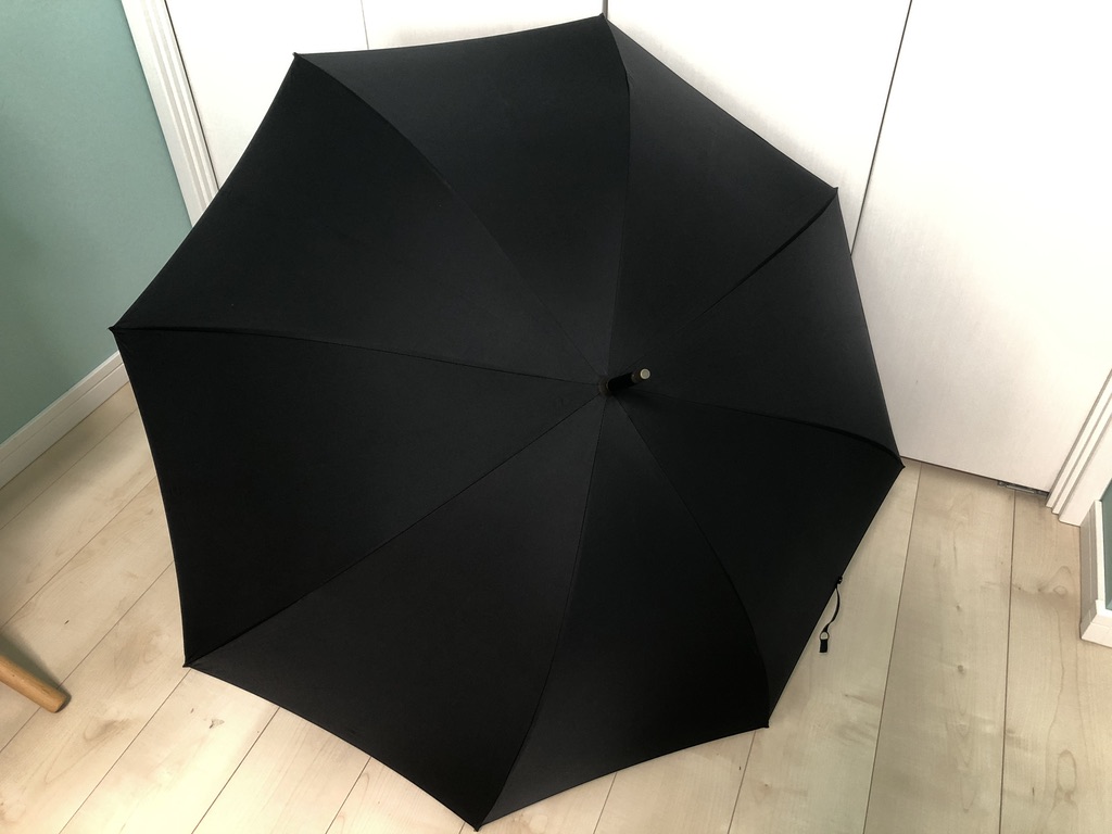 素材的には、傘の布地はナイロンでカラーはブラック、持ち手の部分がメタルで、できてます。フレームの数は8本です。